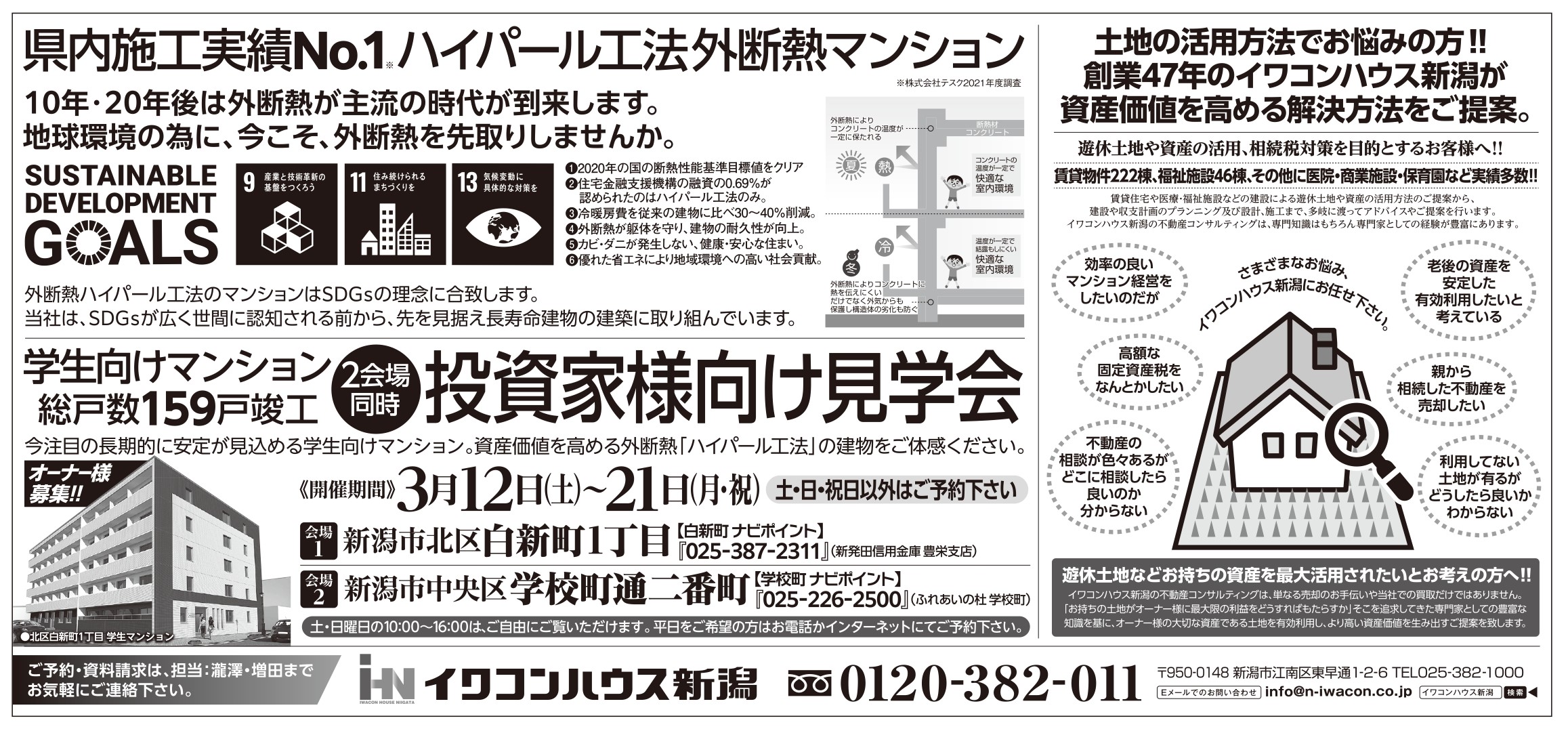 2022.3.11の 新潟日報朝刊に新潟市内2カ所で行われる「学生マンション見学会」広告が掲載されました。