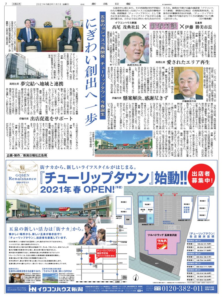 2021.1.1の新潟日報に 五泉市 伊藤市長とイワコンハウス新潟社長 髙尾の対談記事が掲載されました。