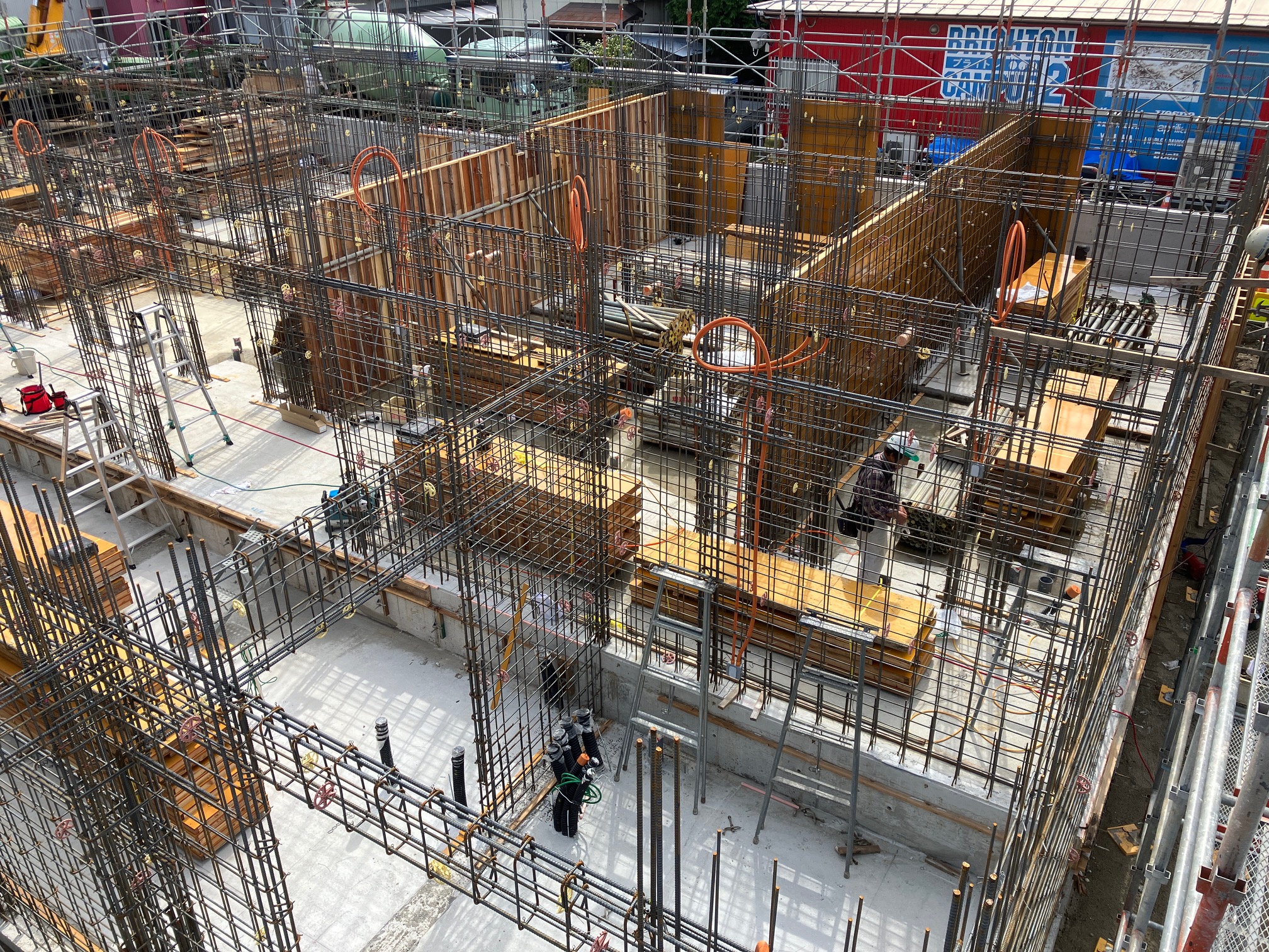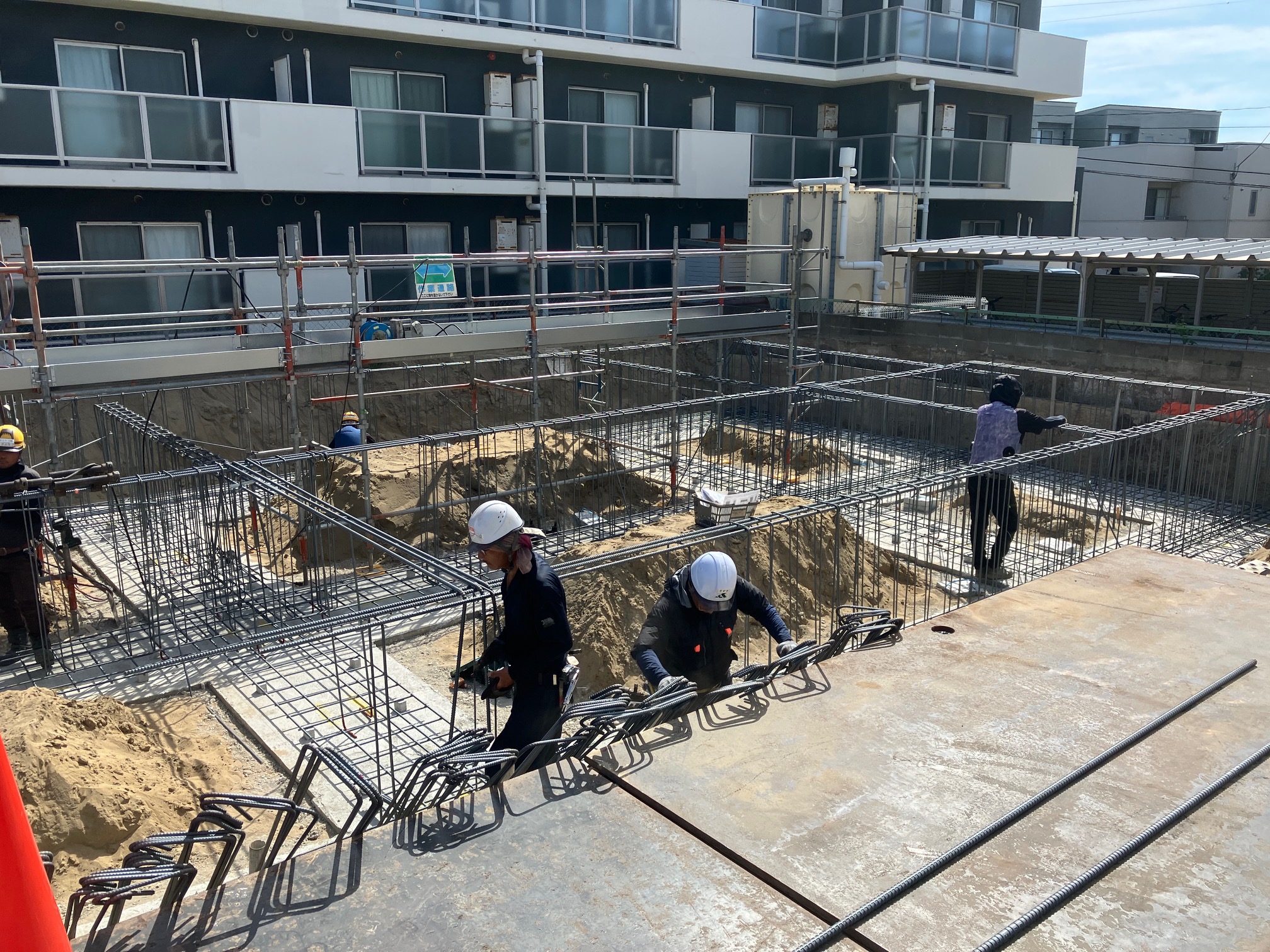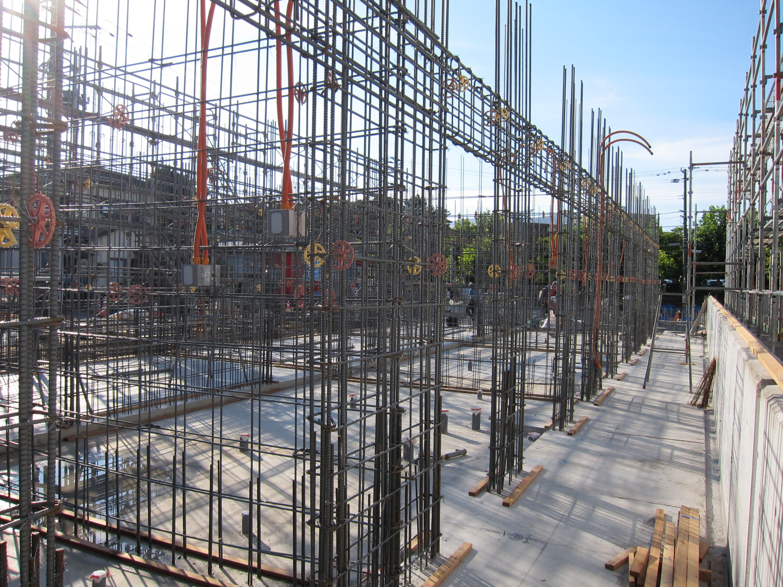 現在は、構造壁を構成するための鉄筋工事および型枠工事を進めています。