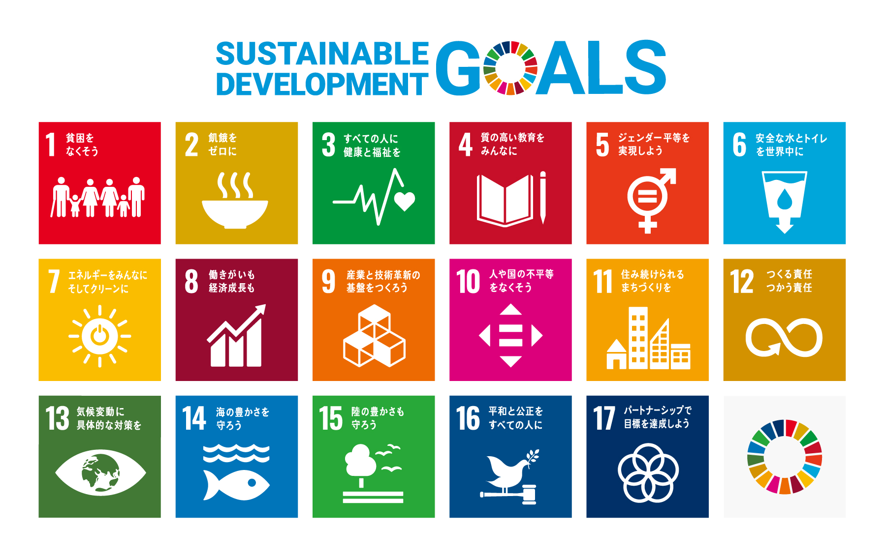 持続可能な開発目標(SDGs)とは、2001年に策定されたミレニアム開発目標(MDGs)の後継として、2015年9月の国連サミットで採択された「持続可能な開発のための2030アジェンダ」にて記載された2030年までに持続可能でよりよい世界を目指す国際目標です。17のゴール・169のターゲットから構成され、地球上の「誰一人取り残さない(leavenoonebehind)」ことを誓っています。SDGsは発展途上国のみならず、先進国自身が取り組むユニバーサル(普遍的)なものであり、日本としても積極的に取り組んでいます。