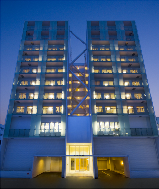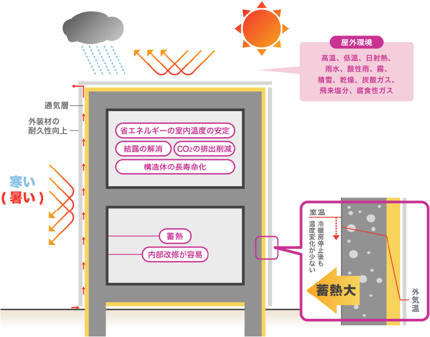 外断熱ハイパール工法は、従来の内断熱と比べ冷暖房によるエネルギー消費を約半分に抑え、耐久性も180 年以上。また、一年を通じて室内温度が一定のため、カビやダニの発生を抑制し、浴室での死亡原因の多くを占めるヒートショックも防ぎます。 まさに、人にも地球環境にも優しい究極の工法と言えます。施設建設を通じて、地域の福祉に貢献