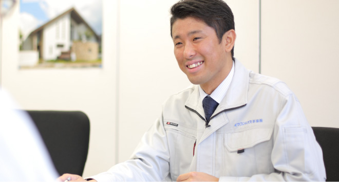 なんと言っても、お客様からの「ありがとう」の言葉がやりがいにつながっています。お客様と営業、設計、コーディネーターが打合せを重ねた後、最後にそれを住宅という「カタチ」にする施工管理の仕事の責任は大きいと思います。また、年齢がはるかに上の職人の皆さんに指示を出し、一つの現場をまとめるにはコミュニケーション能力も必要で、時には苦労もありますが、お客様から頂く感謝の言葉で、一気に吹き飛んでしまいます。